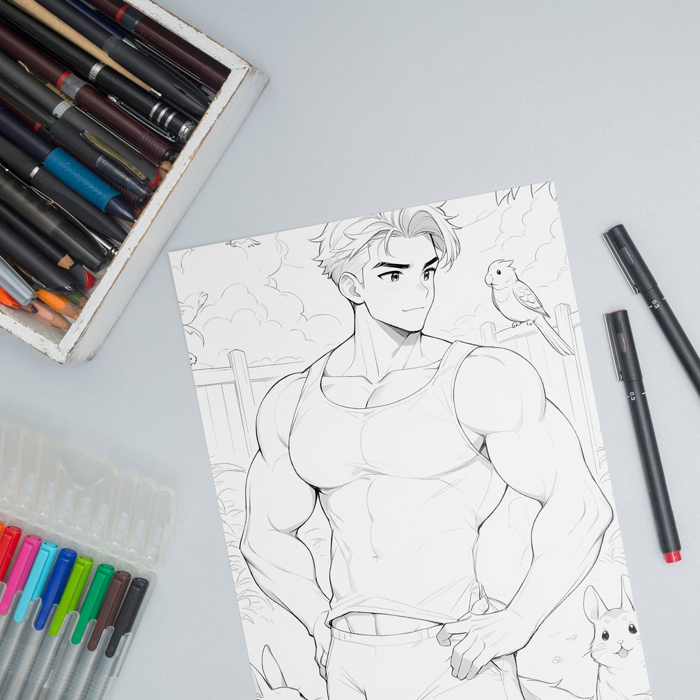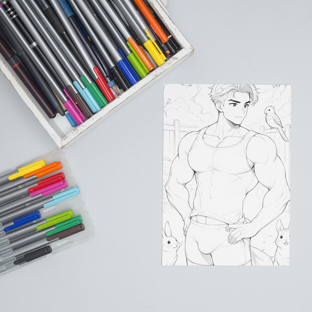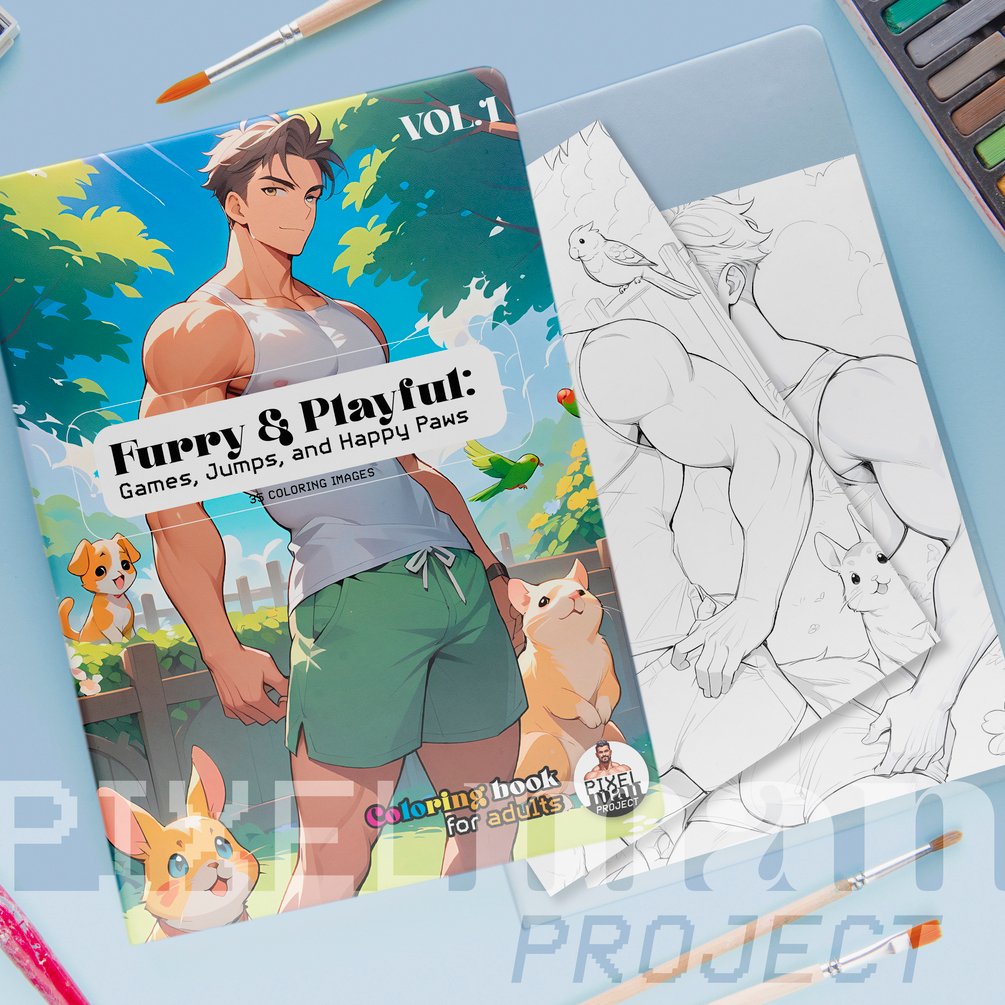 A coloring fantasy filled with sensuality, tenderness, and playful fur. 35 adult illustrations where masculine beauty and desire play among gardens, sunlight, and loyal companionship. Download, print, and bring it to life with your personal touch. 🌿🐾🎨